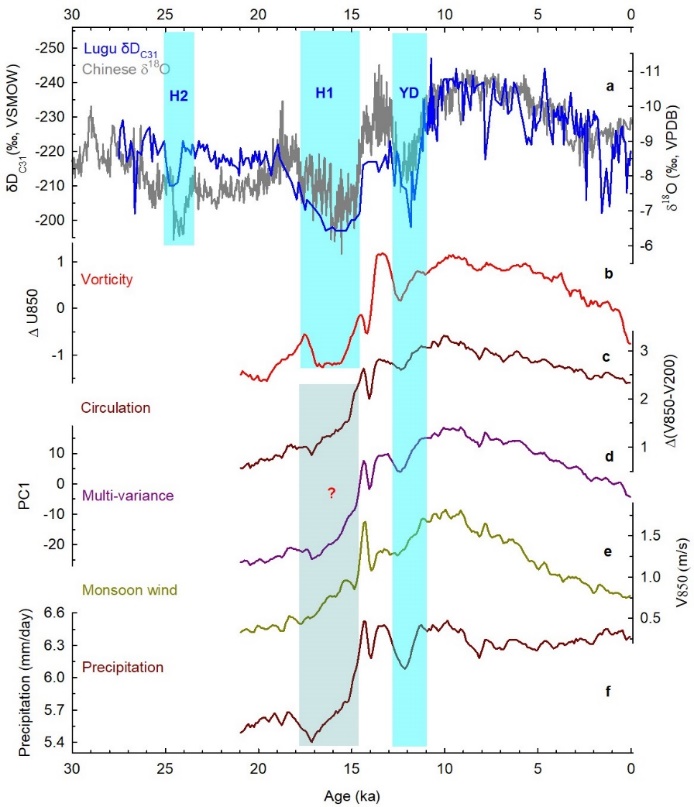 图1.重建的泸沽湖叶腊氢同位素(蓝色,本研究)与董歌-葫芦-三宝洞石笋氧同位素序列(a),TraCE21ka模拟的季风槽涡度(b)和其它相关季风指数(c-f)