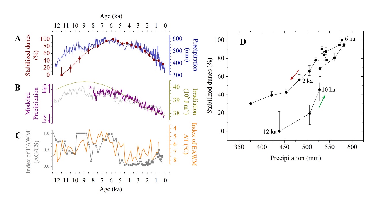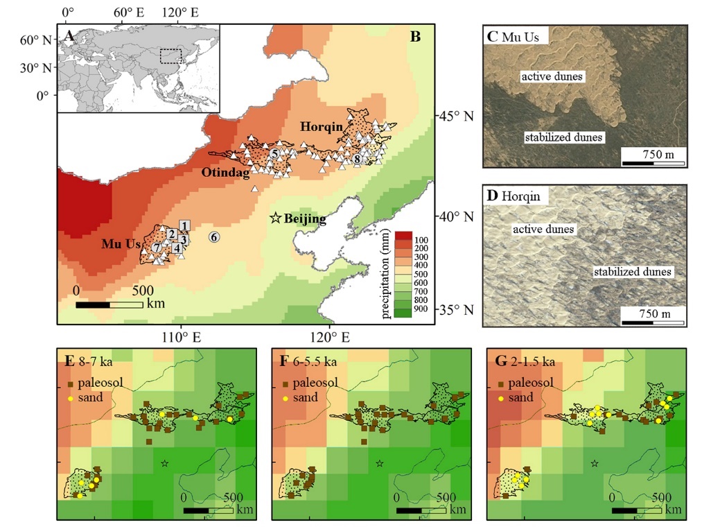 围绕干旱区环境变化,博彩论坛地理博彩论坛 鹿化煜教授的研究团队在我国北方沙漠沙地开展了二十年的研究工作。近年来,在科技部重点研发计划和国家自然科学基金等项目的支持下,他们对多个沙漠沙地开展了“拉网式”考察和大量样品采集、测试分析,构建了近百个有精确年代控制的风沙沉积记录,取得了一系列科研成果。2016年起,该团队徐志伟博士等与博彩论坛生科院徐驰教授团队协同美国、荷兰、以色列以及国内多个高校的学者组成的多学科联合团队,针对我国北方半干旱地区的主要沙地(包括毛乌素沙地、浑善达克沙地和科尔沁沙地等)144处风沙沉积进行了基于过程分析的点位特异性重建与集成,利用500多个地层-独立年代数据和古气候重建-模拟资料,获得了这些沙地过去一万两千年的环境变化历史(分辨率达到五百到一千年)。研究发现,我国北方沙地在过去一万两千年以来就存在与现今类似的流动沙丘与固定沙丘共存的现象,并且在距今六千年前后流动沙丘面积最少。受到季风降水变化的影响,在局部沙丘状态(流动或固定)的变化在较短时间内发生,表现出明显的突变特征,但突变发生的时间节点具有显著的不同步特征,其演化轨迹也具有鲜明的空间异质性。沙丘双稳态格局的形成及状态突变主要与植被、土壤与风沙活动之间的多种正反馈作用有关,并且受到生态系统内部过程的调节。在全域尺度上的重建结果表明,由于局部空间异质性特征相互抵消,这些沙地的总体状态演化表现为渐变特征,并且与季风降水存在较为明确的定量关系(但仍然存在迟滞现象)。这一研究成果有助于理解目前我国北方沙漠沙地环境变化机理以及预测区域环境变化趋势。这项研究凸显出考虑空间尺度和地表圈层相互作用在干旱区地貌发育和环境变化研究中的重要性,同时为澄清撒哈拉沙漠等全球其它干旱区环境突变和渐变的历史过程和机制提供了重要参考。