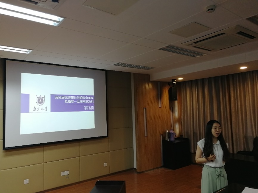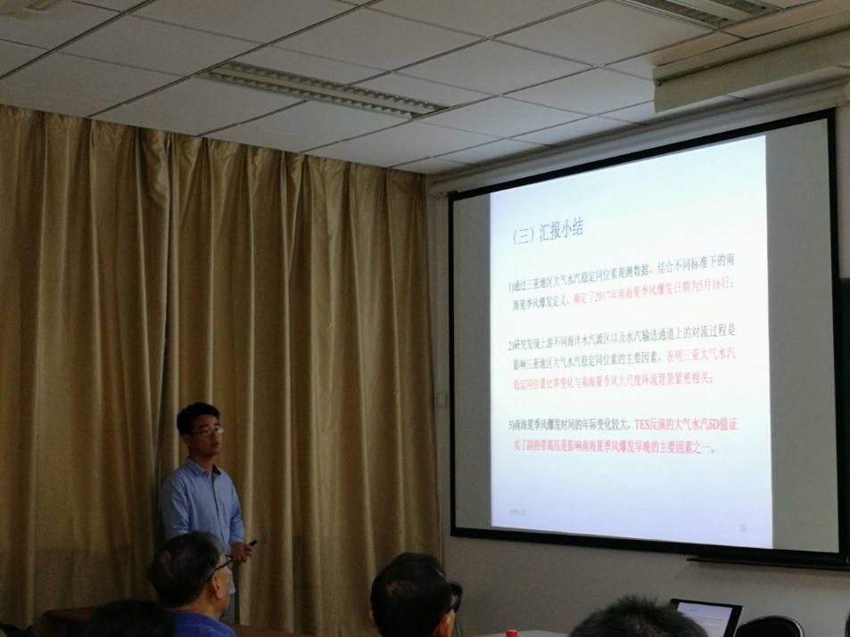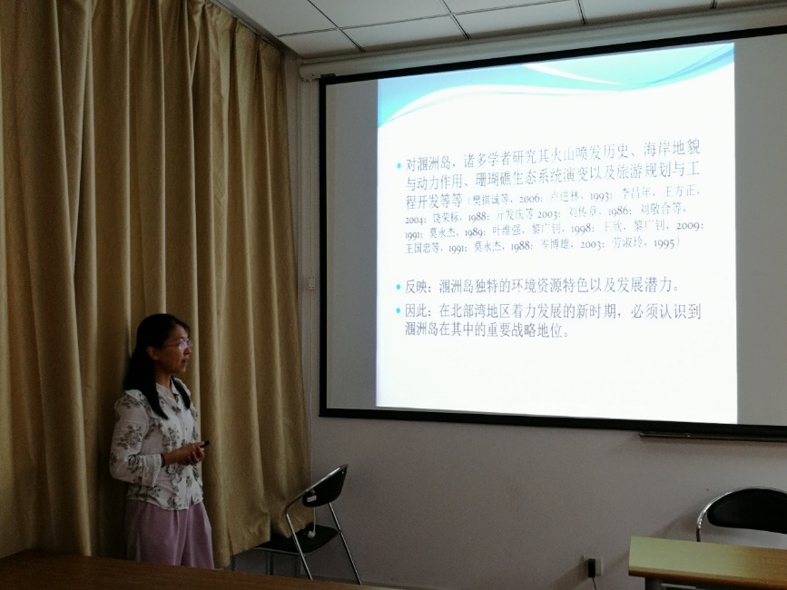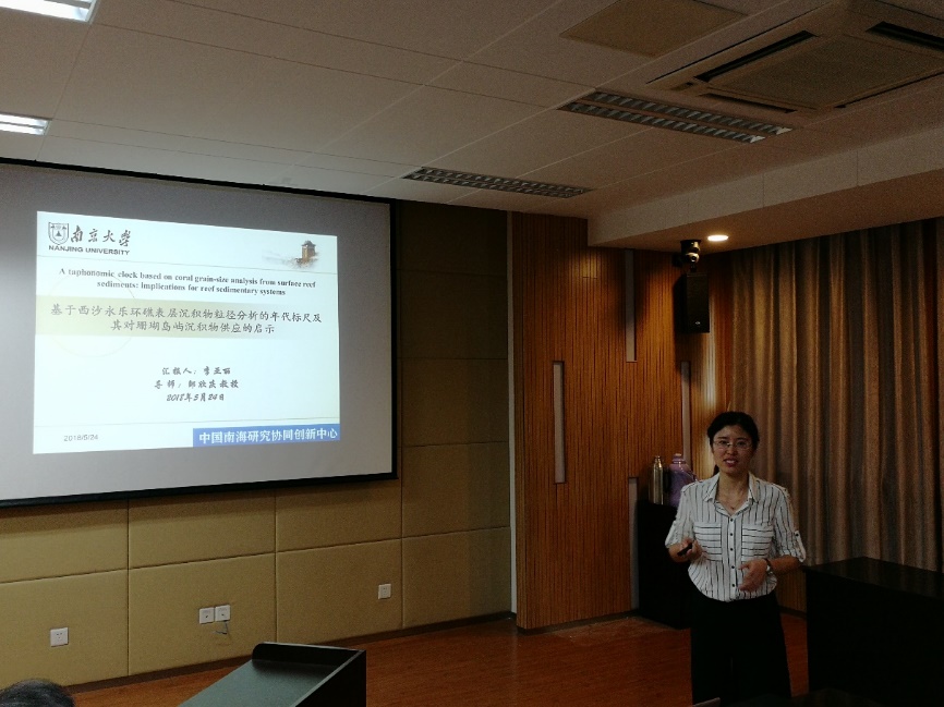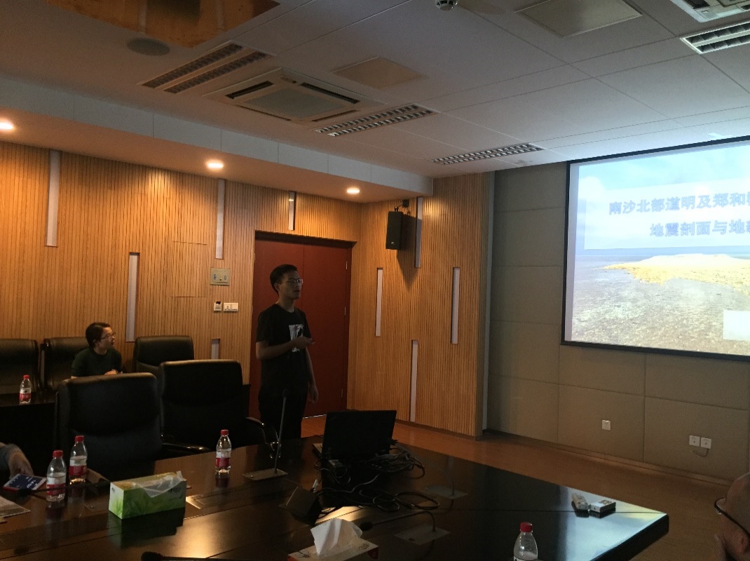 国际视野的重要性。张永战副教授报告了“南海岛礁调查与南沙北部礁岛地貌”,展示了南沙海域岛礁分布、控制现状及三次南沙考察调研所做工作,分析了南沙北部礁岛地貌特点及影响因素。刘绍文副教授报告了“南海北部大陆边缘热流分布特征及其构造意义”,结合已有海洋热流数据阐述南海北部陆缘热状态,探讨了南海陆缘热流格局及机制问题。博士生李亚丽报告了“基于西沙永乐环礁表层沉积物粒径分析的年代标尺及其对珊瑚岛屿沉积物供应的启示”,通过分析西沙永乐环礁表层珊瑚碎屑组分粒径和年代的关系,构建粒径-年代关系模型,讨论了模型的应用前景及对珊瑚礁岛屿沉积物供应的启示。博士生郝喆报告了“海岛居民健康长寿的调查研究及拓展—以海南岛为例”,从海南百岁老人的空间分布、生活习性、环境-人体化学元素的关联三方面探究海南省健康长寿现象、解析海南省百岁老人体内化学元素的含量特征及影响因素。硕士生王飞报告了“南海郑和、道明群礁海域跃层微细结构及其意义”,通过分析南海郑和、道明群礁海域13个站点的温度、盐度、声速等数据,讨论了珊瑚环礁海域跃层微细结构中水深、温度与盐度、密度的变化关系。
