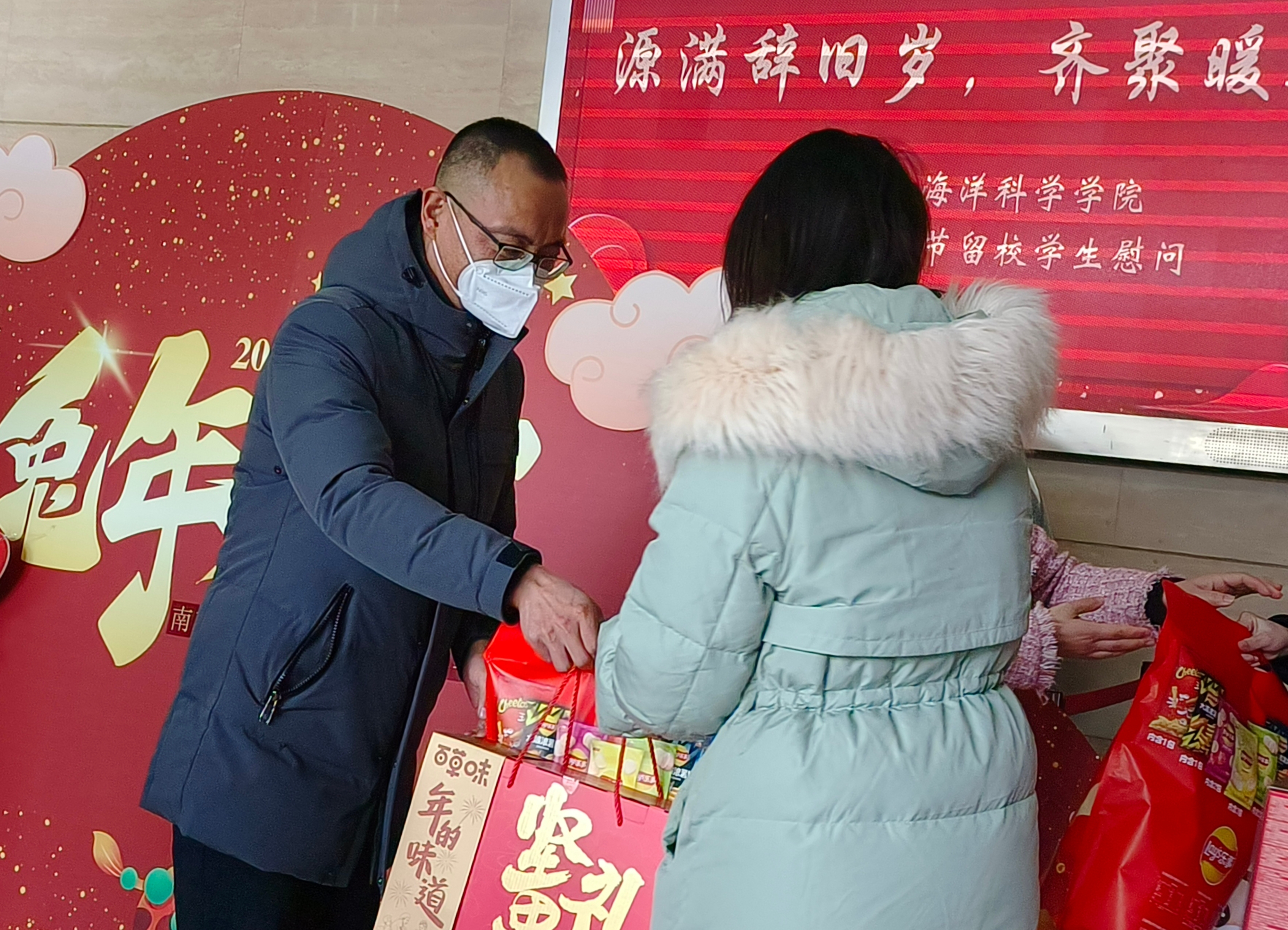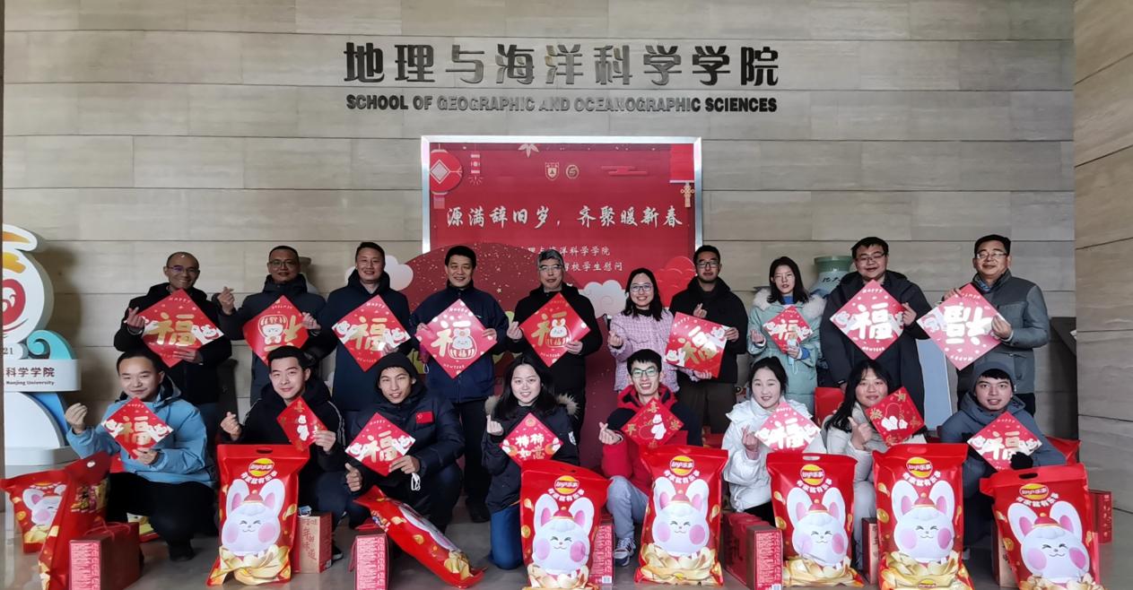时至年关岁末,为加强对留校学生的关怀和帮助,2023年1月16日下午,博彩论坛 在仙林校区昆山楼举行“源满辞旧岁,齐聚暖新春”2023春节留校学生慰问活动。博彩论坛 党委书记李满春,院长鹿化煜,副院长王先彦、金晓斌,党委副书记陈卉,海洋科学系主任高建华,研究生辅导员牛战胜、张馨予齐聚昆山楼大厅,向同学们送去新春祝福和节日问候。
