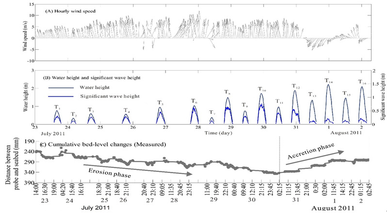 河口海岸、潮汐环境的沉积地貌过程是海岸海洋科学系的传统研究领域。近年来,海岸海洋科学系借助高精度、高时空分辨率的动力-沉积物-地貌观测系统和数值模拟技术,定量研究了河口海岸、潮汐环境中细颗粒物质输运的物理过程和机制,加深了对海岸带侵蚀淤积循环规律的认识。近期在长江口崇明东滩潮间带的研究发现,(1)侵蚀或淤积过程是由风速-风向和大-小潮周期的交互作用所控制的,即为近岸风和潮汐交互影响的结果(图1);(2)无论是在正常天气还是在风暴天气,近岸风均可以显著改变潮滩滩面高程;(3)上述过程可以通过经典的浪-流-沉积物耦合模型来描述和预测。这是对海岸冲淤规律的新认识,有助于进一步发展河口海岸演化的新模式,为建立潮滩和三角洲沉积地貌演化的正演模拟奠定基础,亦可并为海岸带综合管理和生物工程建设提供科学依据。该项成果以博彩论坛 为第一单位发表于Nature Index期刊,论文的第一作者为博彩论坛 史本伟博士:Shi, B. W., S. L. Yang, Y. P. Wang, G. C. Li, M. L. Li, P. Li, and C. Li, 2017. Role of wind in erosion-accretion cycles on an estuarine mudflat. Journal of Geophysical Research: Oceans, 121(1): 193–206, doi:10.1002/2016JC011902.。该项工作得到了国家自然科学基金面上项目的资助。