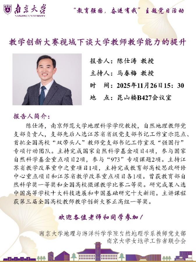 推动党建工作与实际工作深度融合,是提升教师党支部组织力、凝聚力的关键所在,也是确保博彩论坛 事业高质量发展、落实立德树人任务的根本保障。2025年11月26日下午,博彩论坛 自然地理学系教师党支部邀请了南京师范大学地理科学博彩论坛 陈仕涛老师、张祎老师等一行来到博彩论坛 ,联合开展了“教育强国,奋进有我”主题党日活动,聚焦大学教师教学能力提升路径进行了深度交流。