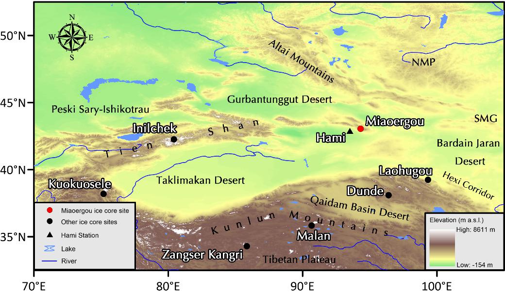 图1. 东天山庙儿沟冰芯钻取位置示意图