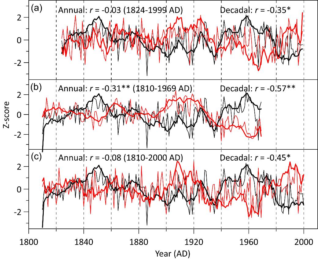 图2. 庙儿沟冰芯粉尘通量与不同代用指标重建的北大西洋涛动指数的关系