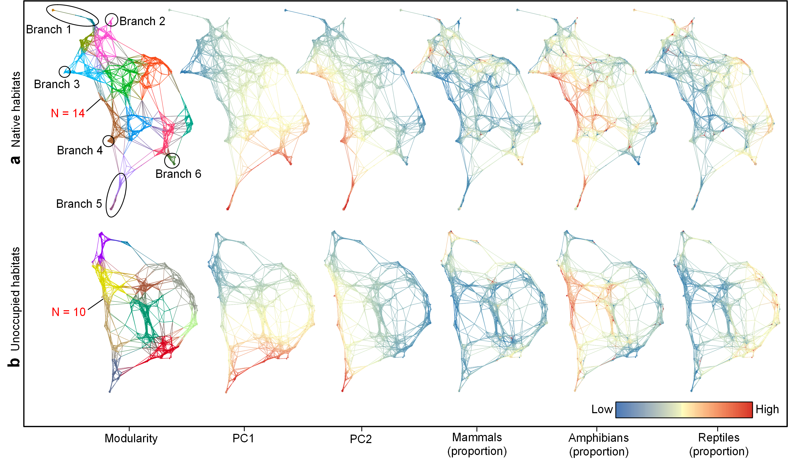 通过地理环境与物种生态位空间的网络映射,构建了全球受威胁陆生脊椎动物物种的生态位网络,网络上的节点代表某种拥有特定资源和环境条件的生态位,它关联于一组生态位特征和偏好相似的物种集合,节点间的连接关系反映了生态位梯度及其连续性(图2)。约 65.4%的网络节点代表的生态位主要由受威胁两栖类物种主导占据,25.2%和9.4%的节点主要以爬行类与哺乳类物种为主。若全球尺度上的原生栖息地持续丧失,生态位网络中的独特分支将面临收缩甚至消失,因此栖息地丧失不仅表现为面积减少,更可能通过驱动生态位网络的重构引发生态位同质化风险。