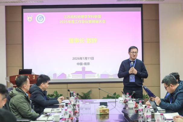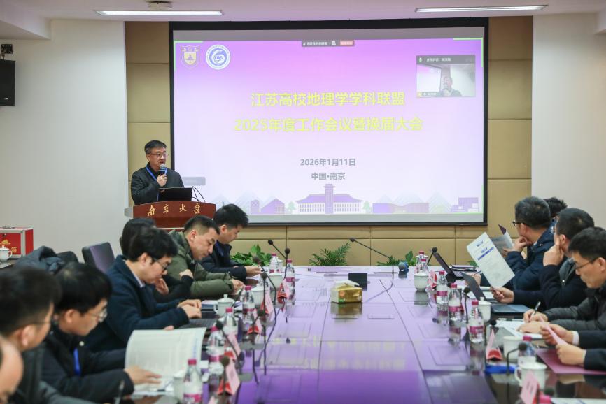 2026年1月11日,江苏高校地理学学科联盟2025年度工作会议暨换届大会在赌博论坛 召开。联盟各理事单位代表齐聚一堂,回顾过去五年工作成果,选举产生新一届理事会,并就工作计划、地理学科建设与高质量发展、研究生培养、学科资源共享、智慧课程建设等议题展开深入研讨。