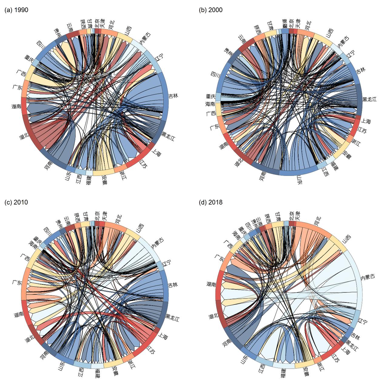 图3 1990-2018年谷物生产地-消费地流动模拟时空格局