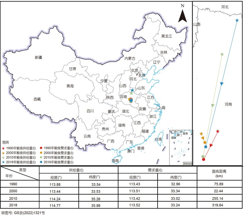 图2 1990-2018年中国谷物供需重心迁移分析