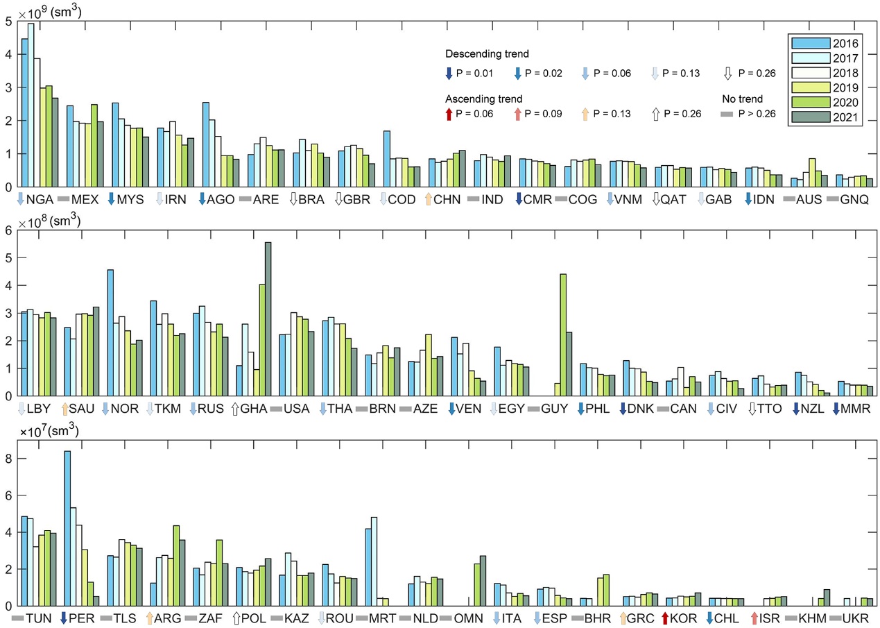 图7 2016–2021年各国离岸伴生天然气年燃烧排放量估计结果