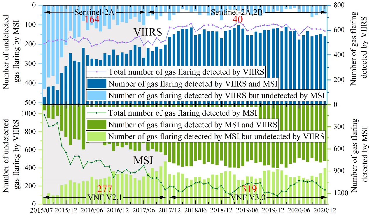图4 全球离岸伴生天然气燃烧清单数量(月度)对比(MSI:本研究;VIIRS:已有清单)
