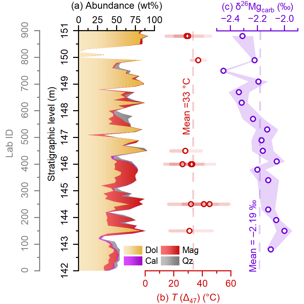 图1 卢氏盆地中始新世湖相沉积序列的矿物、团簇同位素和碳酸盐镁同位素记录