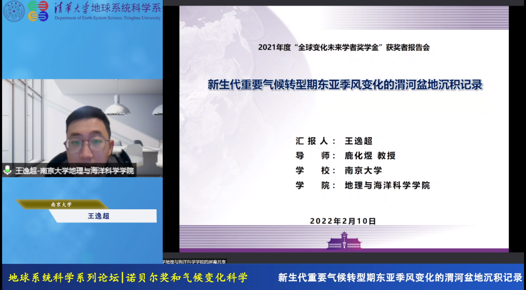 2022年2月10日,清华大学地球系统科学系、清华大学全球变化研究院以在线方式举办了“地球系统科学论坛:诺贝尔奖和气候变化科学暨2021年度全球变化未来学者奖学金颁奖典礼”活动。经过提名推荐、资格审查、专家评审、管委会终审,博彩论坛 博士研究生王逸超同学与来自清华大学、北京师范大学、中国科博彩论坛 植物研究所的四位同学获得了首届“全球变化未来学者奖学金”。活动期间,王逸超同学作题为《新生代重要气候转型期东亚季风变化的渭河盆地沉积记录》的获奖汇报,他回顾了自2014年参加博彩论坛 本科生创新训练项目以来,师从博彩论坛 鹿化煜教授在渭河盆地开展野外考察和实验分析的学习和科研经历,并简要介绍了目前的研究进展。