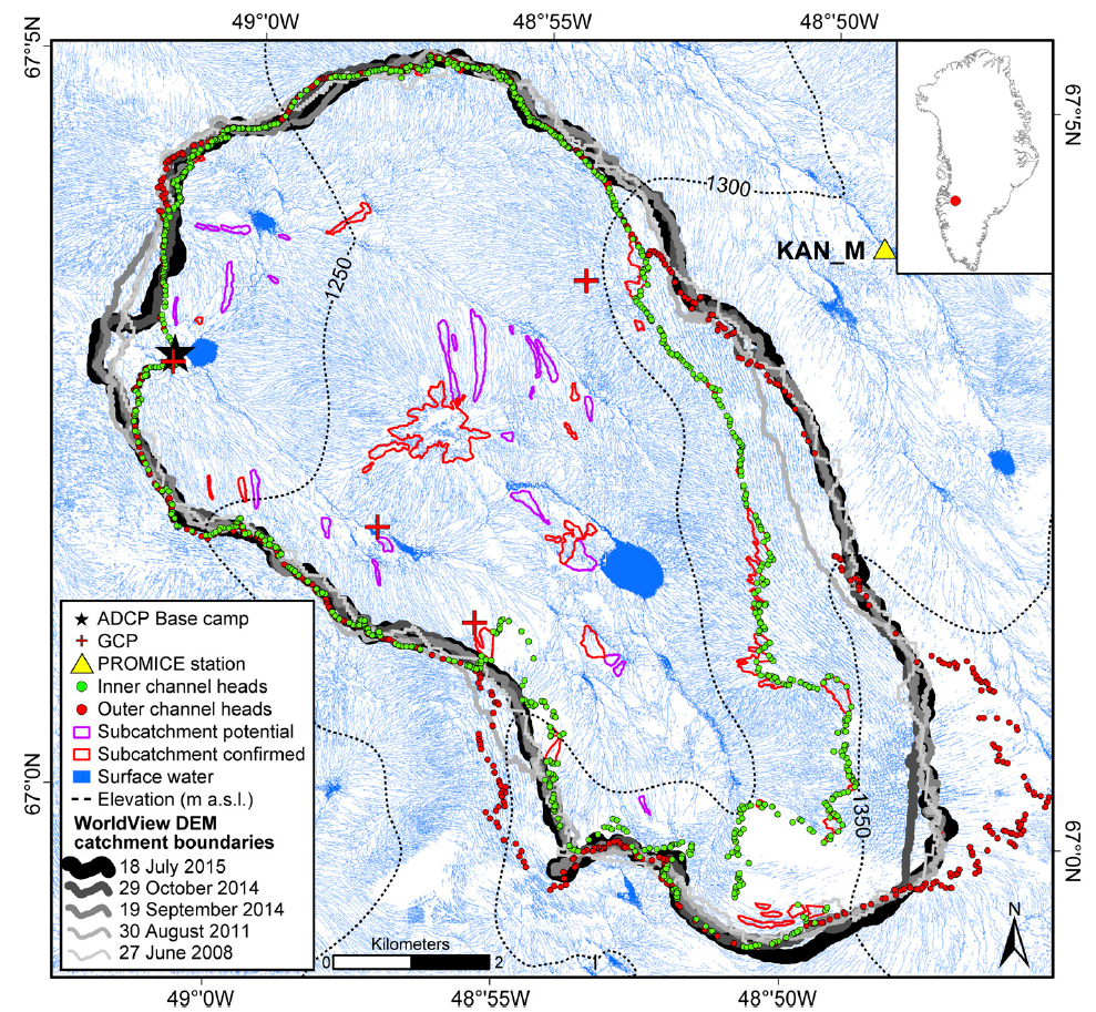 图2. 格陵兰冰盖表面典型集水区冰面水系专题制图