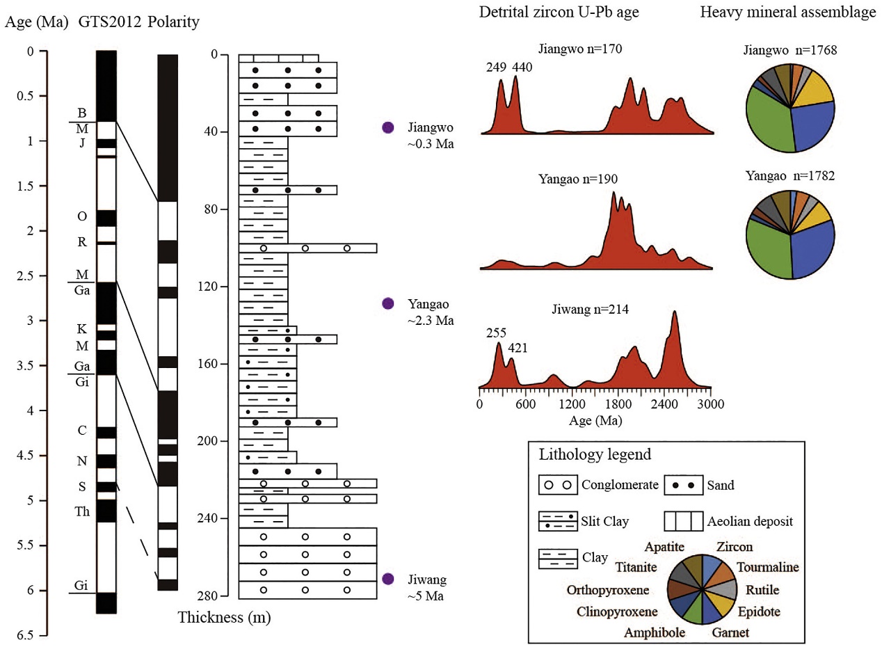 图2 河南三门峡盆地沉积序列碎屑锆石年龄谱和重矿物组合特征揭示黄河物质来源的变化。