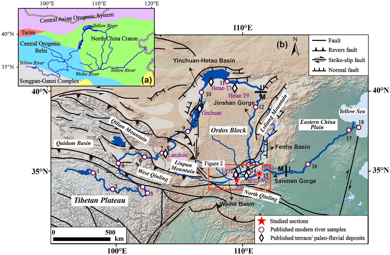 最近,在国际知名学术刊物《Palaeogeography, Palaeoclimatology, Palaeoecology》上,发表了我 院张瀚之博士等研究论文,她们提出了黄河可能形成于约五百万年的新认识。张瀚之及其合作者基于黄河上游和中游联通后,河流沉积物组成一致的原理,对黄河中游和上游的三门峡盆地、渭河盆地和相关区域的河流沉积物组成特征进行了系统研究。她们采集了现代渭河、灞河河流沉积物样品、陕西渭南张家坡和河南三门峡黄底沟地质时期河流沉积物序列样品进行分析,总结了黄河上游中游不同地区、不同潜在物源的沉积物特点;以沉积物中碎屑锆石铀-铅年龄谱(相当于锆石矿物的DNA)和重矿物组成为指标,对比了古代和现代不同时间、不同区域的锆石年龄谱和重矿物组成。结果发现,在至少五百万年以前,黄河中上游祁连山地区、晋陕峡谷等物质已经流入三门峡盆地(位于河南西部),表明那时黄河上游和中游可能已经联通,类似于现代黄河的水系基本形成(图1、图2)。这个结论依据沉积序列的系统分析和物质特征直接对比,为认识黄河形成演化历史提供了重要证据。此前,张瀚之博士等通过对渭河盆地沉积物锆石年龄谱的研究,揭示了黄河流域环境演变过程,相关论文发表在《Geophysical Research Letters》, 《Journal of Geophysical Research》,《第四纪研究》等国内外知名学术刊物,为认识黄河演变提供了证据