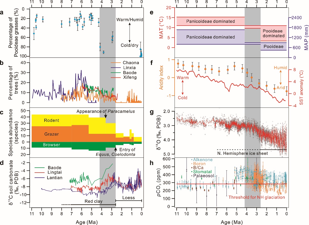 研究团队对渭河盆地的河湖相沉积序列与黄土高原、青藏高原、中亚沙漠等沉积进行了广泛深入的研究,结合年代学、古气候学和沉积物物理、化学、生物指标的分析,在Earth-Science Reviews和《第四纪研究》发表论文,论证了现代中亚和亚洲东部沙漠景观形成于上新世末期,此前的沙漠是“红色沙漠”,是干热气候条件下的产物;第四纪初期(距今约260万年),亚洲中部和东部的红色沙漠被“黄色沙漠”取代。同样,渭河盆地的沉积记录显示,上新世之前产生于季风气候条件下河道纵横、湖泊广布的地表,以及乔木茂密、哺乳动物多样的景观,是早期渭河盆地受季风气候控制的证据。在上新世末期,气候变干、现代季风环流形成。渭河盆地的长序列记录与中国北方的黄土记录、中亚的沙漠记录有很好的对应,揭示了全球温度变化在调控亚洲季风和干旱环境过程中的重要作用。鹿化煜教授是这两篇论文的第一作者和通讯作者。