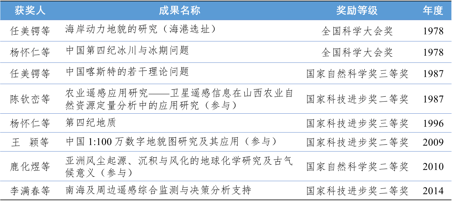 地理学研究地球表层各要素之间的相互作用和时空变化规律以及人地关系,关乎自然资源利用、生态文明建设和自然灾害防治等国计民生。地理学经世致用,服务国家需求。早期,竺可桢先生的季风气候研究、张其昀先生的历史地理研究、胡焕庸先生的中国人口密度分界线(现称为“胡焕庸线”)以及杨怀仁先生的南海诸岛研究,均在国内外产生了深远而持久的影响。1952年以来,面向国家经济建设和自然资源利用综合调查之需求,一方面积极推动研究机构建设,相继成立了非洲研究所、环境地理研究室、遥感应用研究室、海洋地貌与沉积室、第四纪环境预测研究室和城市规划设计研究所等。特别是,1990年,受世界银行贷款和加拿大国际发展中心资助,组建“海岸与海岛开发”国家试点实验。另外,承担国家任务大力开展科学考察,结合国民经济发展中提出的实际问题进行研究,先后开展了自然地理区划和准热带研究、岩溶发育理论、长江研究、第四纪环境演变、海岸地貌与沉积、海岸带和滩涂资源综合考察、海港选址、农业遥感、城市与区域规划、非洲地理和旅游地理等方面的工作,成果获得国家科技奖励8项、省部级科技奖励100余项。其中,任美锷院士牵头的“中国喀斯特的若干理论问题”荣获1987年度国家自然科学三等奖,陈钦峦教授参与的项目“卫星遥感信息在山西农业自然资源调查中的应用研究”荣获1987年度国家科技进步奖二等奖,王颖院士参与的“中国1:100万数字地貌图研究及其应用”荣获2009年度国家科技进步奖二等奖,李满春教授牵头的“南海及周边遥感综合监测与决策分析支持”获得2014年度国家科技进步奖二等奖。
