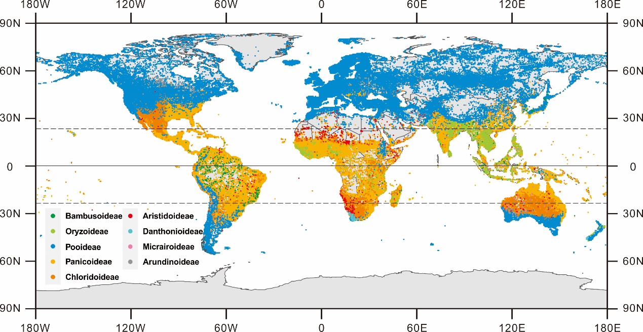 最近,在国际权威学术刊物《Earth-Science Reviews》上,发表了博彩论坛 王翰林博士和鹿化煜教授的学术论文,他们研究和总结了全球各个大陆C4植被的扩张历史及其驱动机制,强调了气候要素的控制作用。这项研究首先建立了全球现代禾本科物种与气候对应关系数据集~1200万条,发现~10°C等温线是北美、东亚地区早熟禾亚科和黍亚科/虎尾草亚科分布的分界线,~400 mm等降水量线是北美、南非地区黍亚科和虎尾草亚科的分界线;同时发现各个大陆禾本科物种分布特征、气候适应区间有所不同,可能原因是区域气候,地形和本地物种等非生物和生物因素造成的。