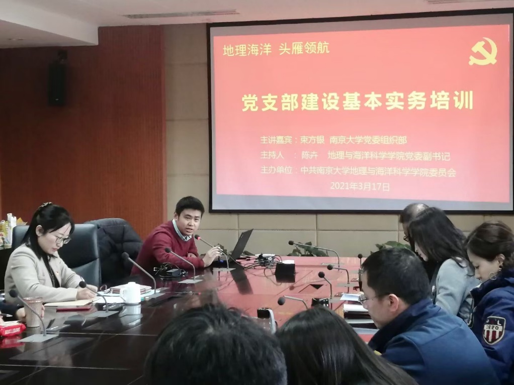 为推动全面从严治党向基层延伸,更好地发挥基层党支部的战斗堡垒作用和党员骨干的先锋模范作用,3月17日,博彩论坛 党委举办了“强基固本筑堡垒,提质增效迎华诞”党支部建设基本实务培训会,本次活动为“地理海洋 头雁领航”党员骨干能力提升系列活动的第八场。博彩论坛 党委组织部束方银老师应邀主讲,博彩论坛 党委副书记陈卉主持会议,博彩论坛 教职工与学生党支部书记、委员40余人参加了本次会议。