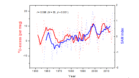 基于以上研究背景,庞洪喜教授课题组根据南极内陆冰盖最高点Dome A地区2个雪坑高分辨率17O-excess测试数据,利用人类核试验产生的放射性物质、火山活动喷发物质作为绝对定年参考层,对Dome A雪坑进行了相对高精度定年,利用目前已知的各种大气再分析资料(包括ERA5、NCEP、ERA-Interim、MERRA2、JRA55、ERA40,避免单一再分析资料造成分析结果的不确定性),结合混合云同位素分馏模型(MCIM)模拟,证实了南极内陆地区雪冰17O-excess受平流层水汽输入影响显著的事实。同时,发现在年际尺度上Dome A雪坑17O-excess主要受BD环流强度控制,二者表现为显著的正相关关系(图1)。此外,研究还发现Dome A 17O-excess与南半球环状模(SAM)存在显著的正相关关系(图2),主要原因是:SAM处于正相位时,南极内陆地区气温低、降水少,较少的降水对平流层水汽17O-excess信号的稀释作用较弱,因此Dome A 17O-excess值较高;反之,SAM处于负相位时,Dome A 17O-excess值较低。17O-excess与SAM显著的正相关关系,进一步证实了平流层水汽输入是影响Dome A 17O-excess变化的主控因素。本研究为利用南极内陆地区冰芯17O-excess记录进行BD环流重建奠定了理论基础,必将推动极地地区冰芯稳定同位素记录与气候变化研究的发展。