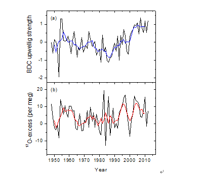 图1 过去几十年BD环流强度(a)与南极Dome A雪坑17O-excess记录之间的关系