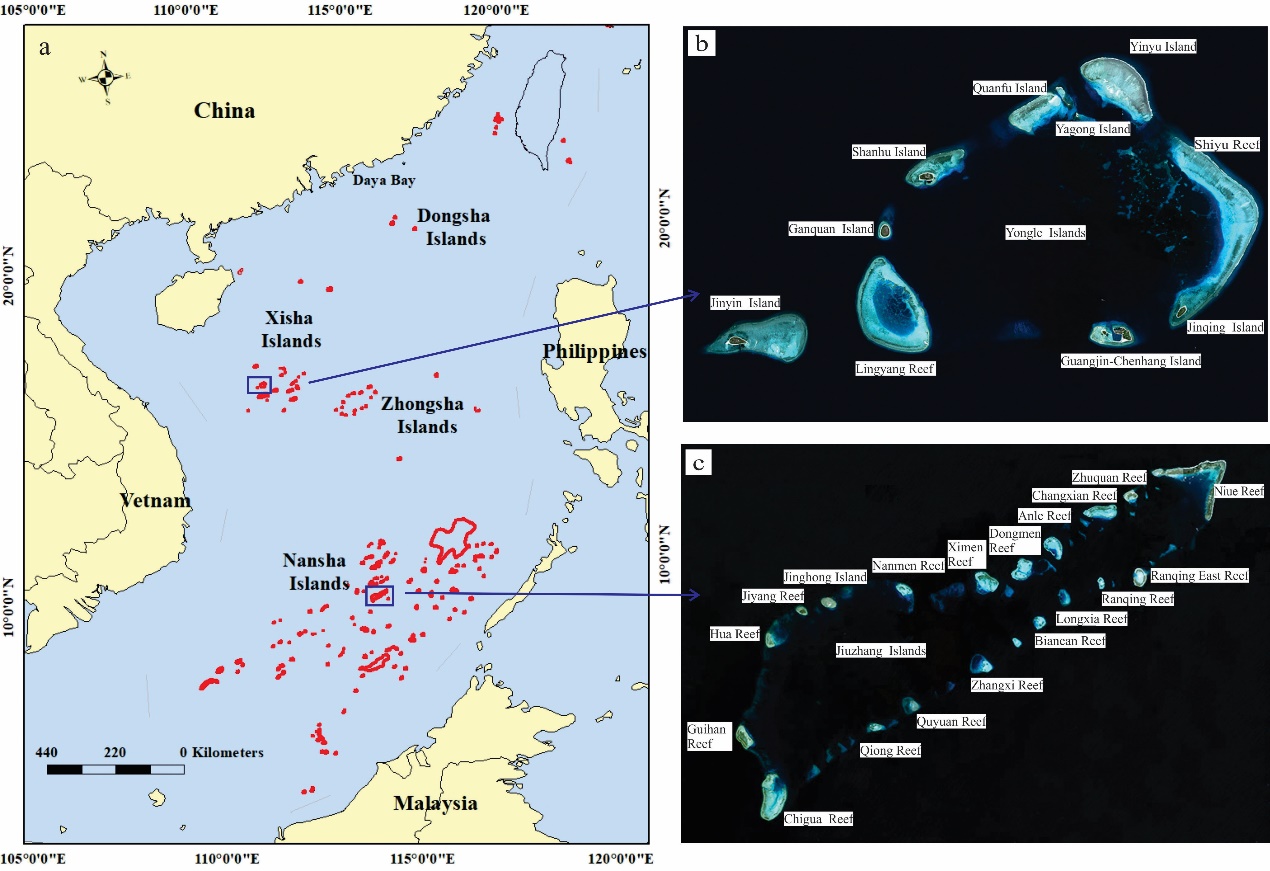 图1 研究区位置图(a)及采样点分布图(b,西沙群岛采样点永乐环礁;c,南沙群岛采样点九章群礁)