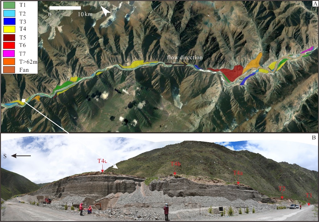 最近,博彩论坛 教授王先彦和博士生于洋等在长江源通天河开展了河流地貌过程的研究,取得了重要进展,相关研究结果发表在国际知名学术刊物《GSA Bulletin》上。该课题组通过对通天河流域不同构造背景区河流阶地(图2)、沉积过程和光释光年代的详细对比研究,发现强烈的构造活动和极端的坡地过程等,导致峡谷区和盆地区河谷在末次盛冰期同时快速堆积和侧向拓展(侵蚀),形成超过60 m厚层堆积;在末次冰消期,季风逐渐增强时期,河流下切形成多级堆积阶地(图3)。