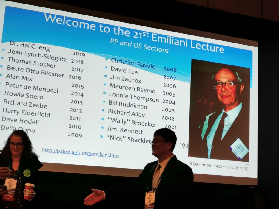 在上周结束的2019年美国地球物理联合会年会(AGU 2019 Fall Meeting)上,博彩论坛 兼职教授程海应邀在大会上做了“Isotopes in Speleothems and Global Climate Change (石笋氧同位素与全球气候变化)”的主题讲座报告。这个讲座以著名地球科学家Cesare Emiliani的名字命名,旨在表彰在环境演变研究领域做出杰出贡献的优秀科研人员。自1999年设立以来每年仅有一人获此殊荣,程海教授是该讲座的第21位演讲者,也是首位华人演讲者。程海教授展示了他们通过高精度的石笋测年和氧同位素研究,揭示了亚洲季风和全球季风气候变化的规律的成果;他们提出的低纬度热量驱动全球气候长期变化的理论假说,可望对传统的天文气候理论提出挑战。程海教授的报告深入浅出、理论与证据紧密结合。一个小时的报告内容丰富,精彩纷呈,受到与会者的高度评价。