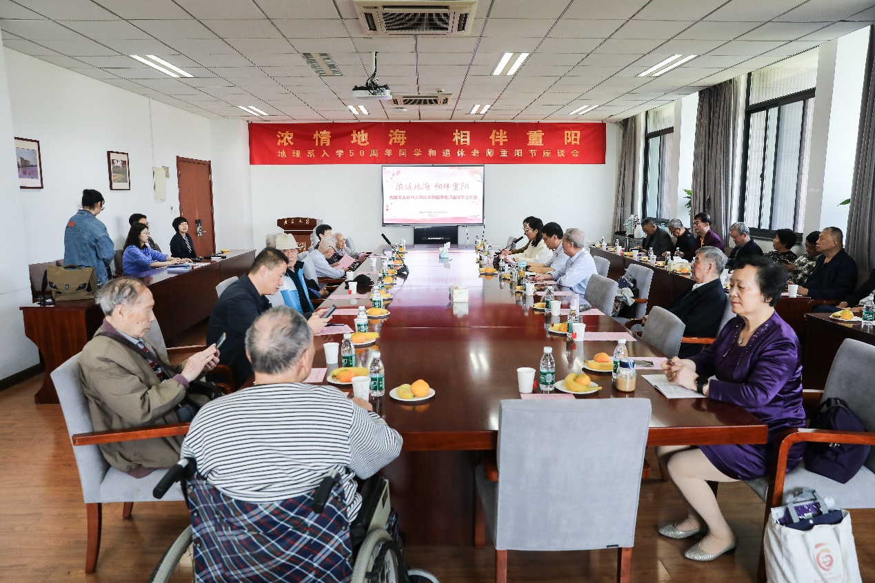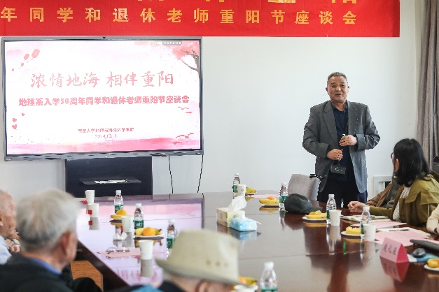 正逢重阳佳节和1974-1975级地理系校友返校日,为表达对退休教师无私奉献与卓越贡献的敬意,深化校友间的交流沟通,共续校园美好记忆,激励在校学子传承尊师重教的传统美德,博彩论坛 于10月11日上午在昆山楼会议室举办了退休老师重阳节暨地理系同学入学50周年校友座谈会,共抒深情厚谊,同绘发展宏图。本次座谈会由博彩论坛 15位退休老师与1974-1975级友参加。院长、党委书记鹿化煜,党委副书记陈卉,副院长金晓斌,代理副院长工作的周雨霁,博彩论坛 办公室张勤主任、骆琼等老师出席了座谈会。座谈会由党委副书记陈卉主持。