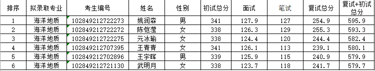 根据《2019博彩论坛 地海院硕士生复试录取工作细则》,海洋地质专业拟接收报考博彩论坛 自然地理学专业调剂考生6人,现将拟录取名单公示如下: